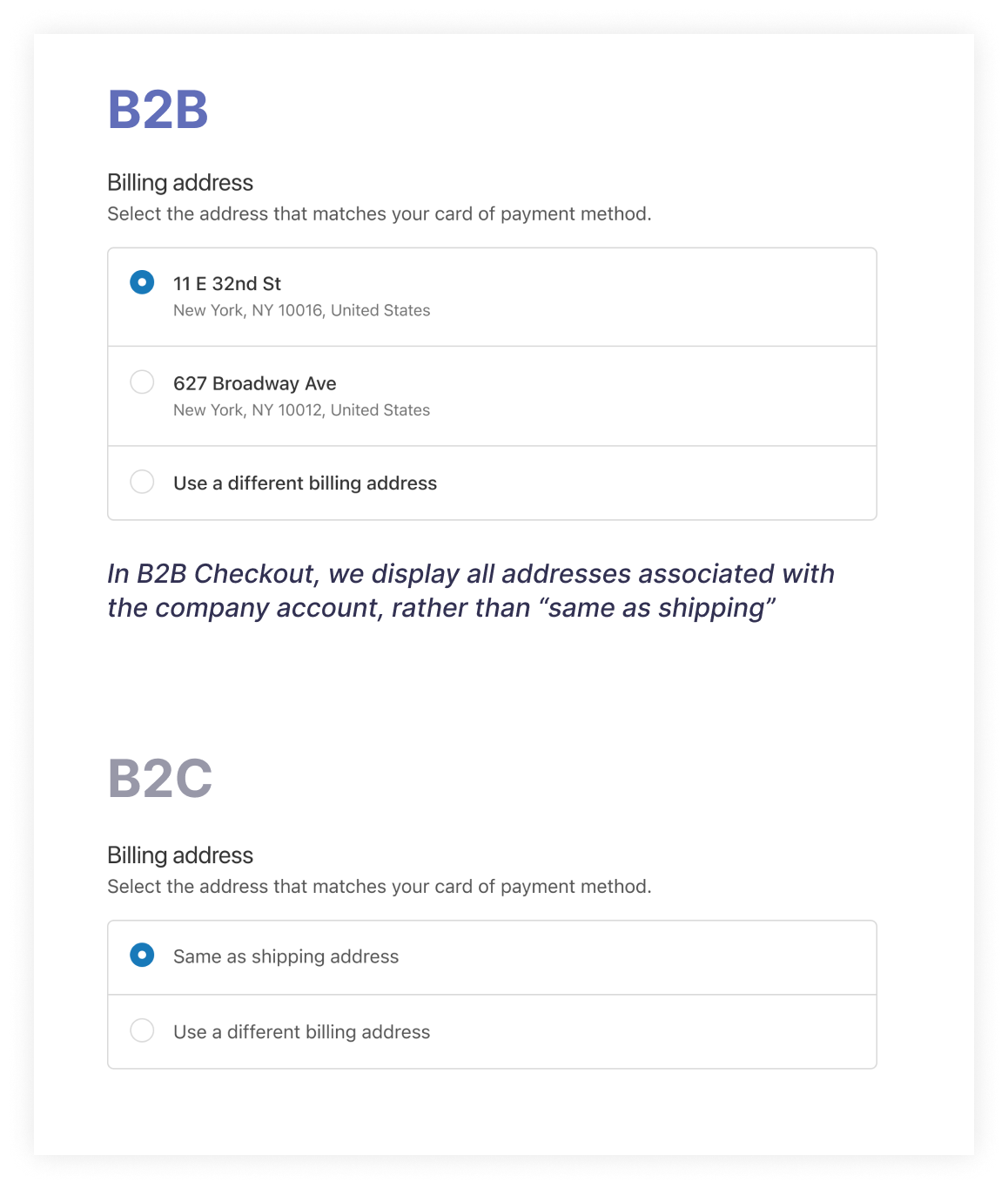 For exmample, In B2C, it is often common for shipping and billing addresses to be the same. However in B2B, that is not typically the case. The address where the shipment location and the billing department can often be separate locations.