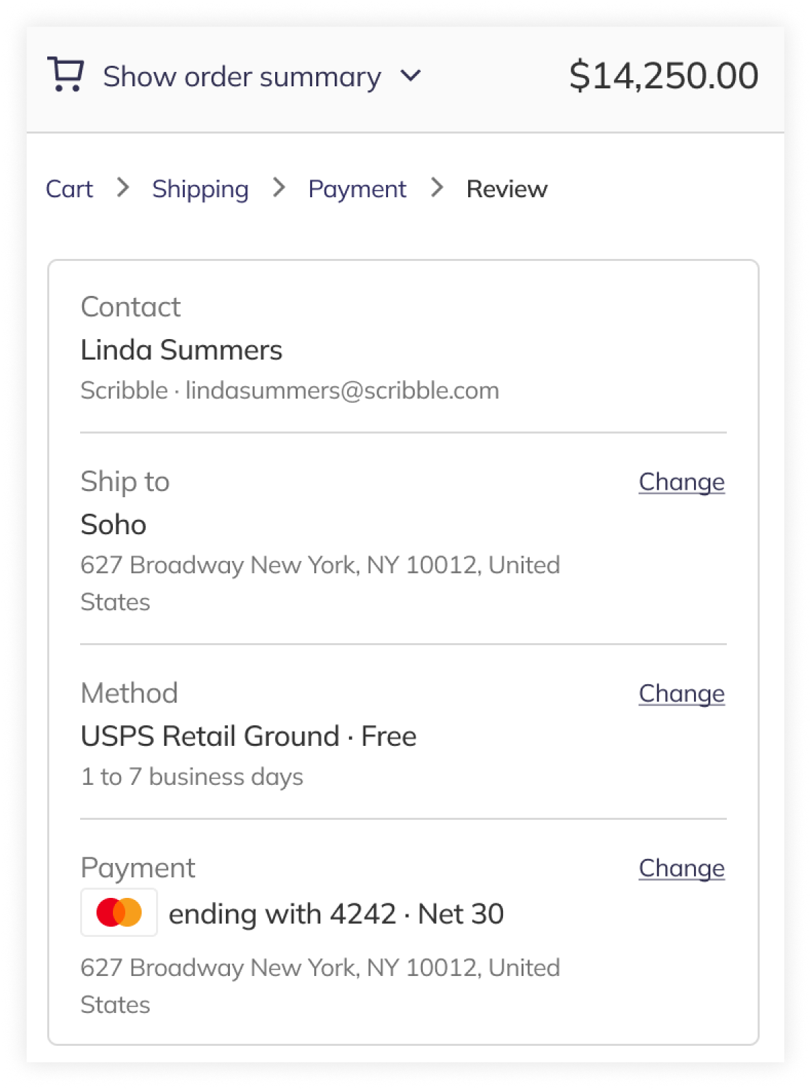 In B2B, there is an existing buying relationship between the merchant and buyer, and it's important that those aspects translate into Checkout.