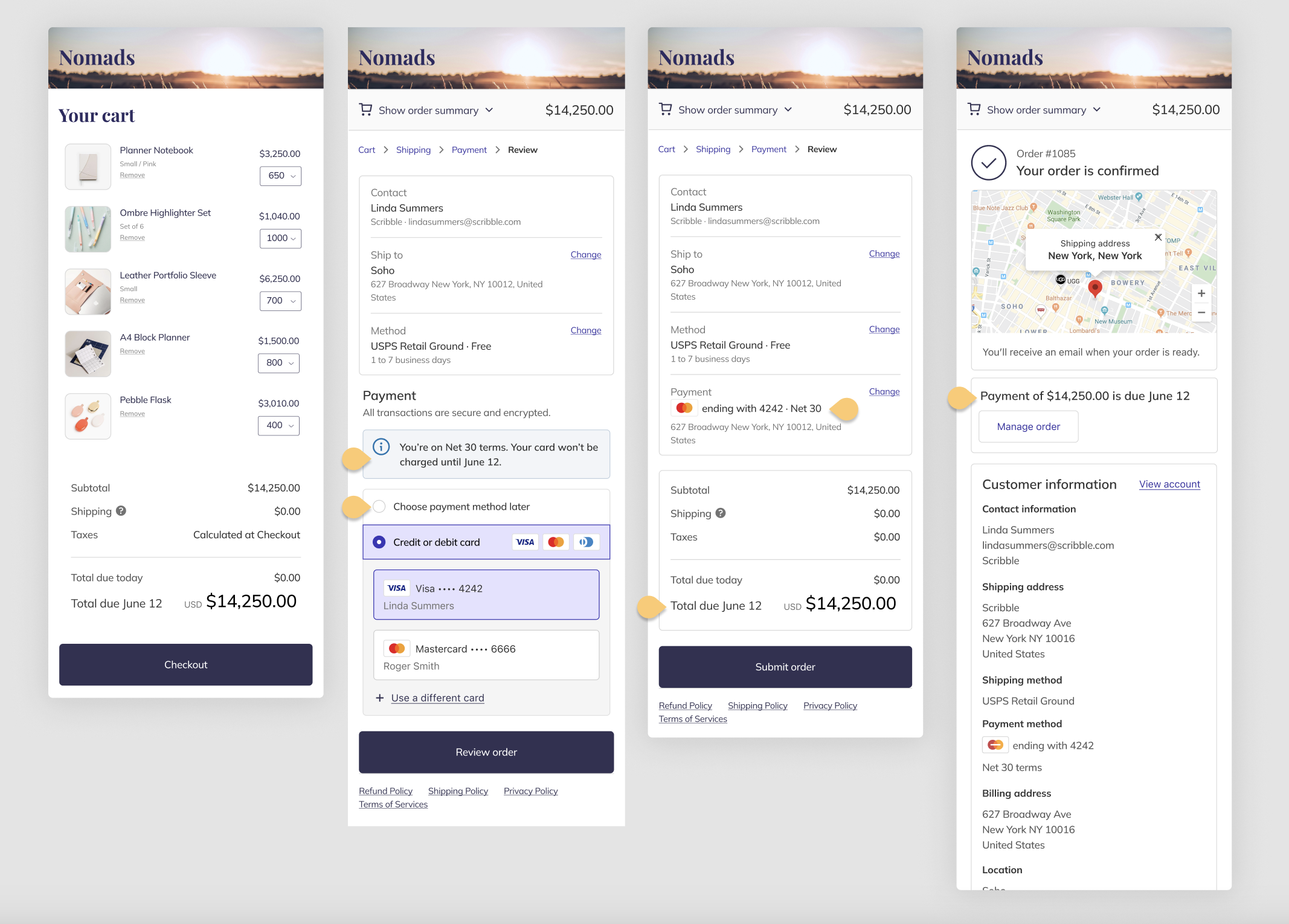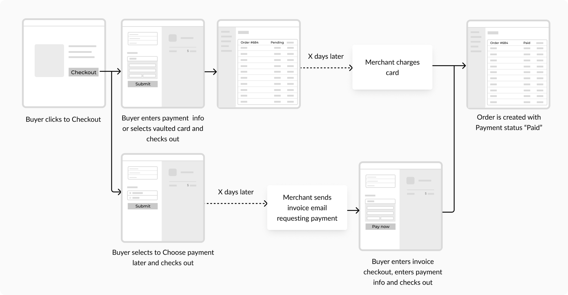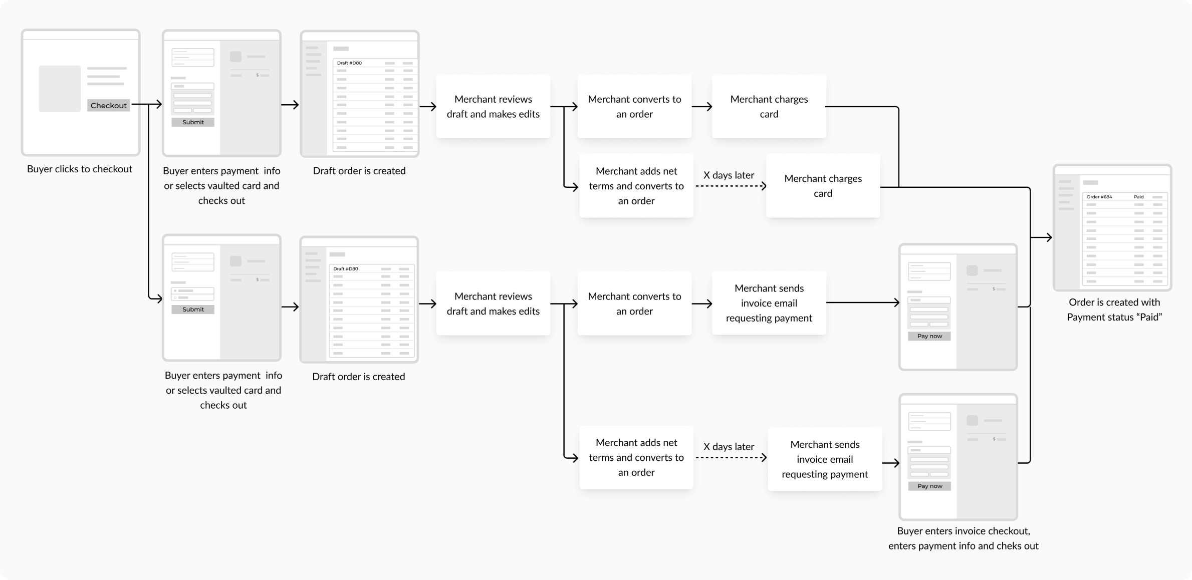 From the B2B merchant needs, I designed 3 main types of checkout flows: