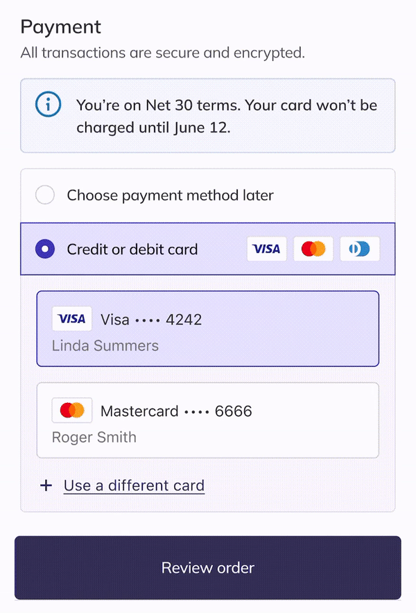 For deferred payment scenarios, buyers have the option to select a vaulted card, enter a new card, or Choose payment later. Selecting “Choose payment method later” lets buyers decide how they’ll pay at a future date - and gives them an opportunity to pay with a check, money order or some other off-Shopify payment method.